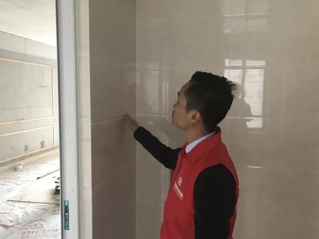 現(xiàn)場檢查是否按圖施工,檢查墻面鋪磚平整度