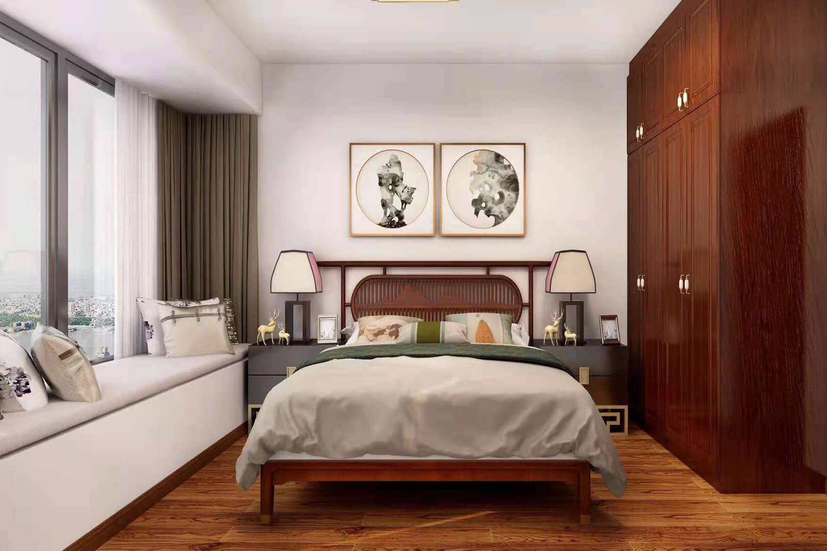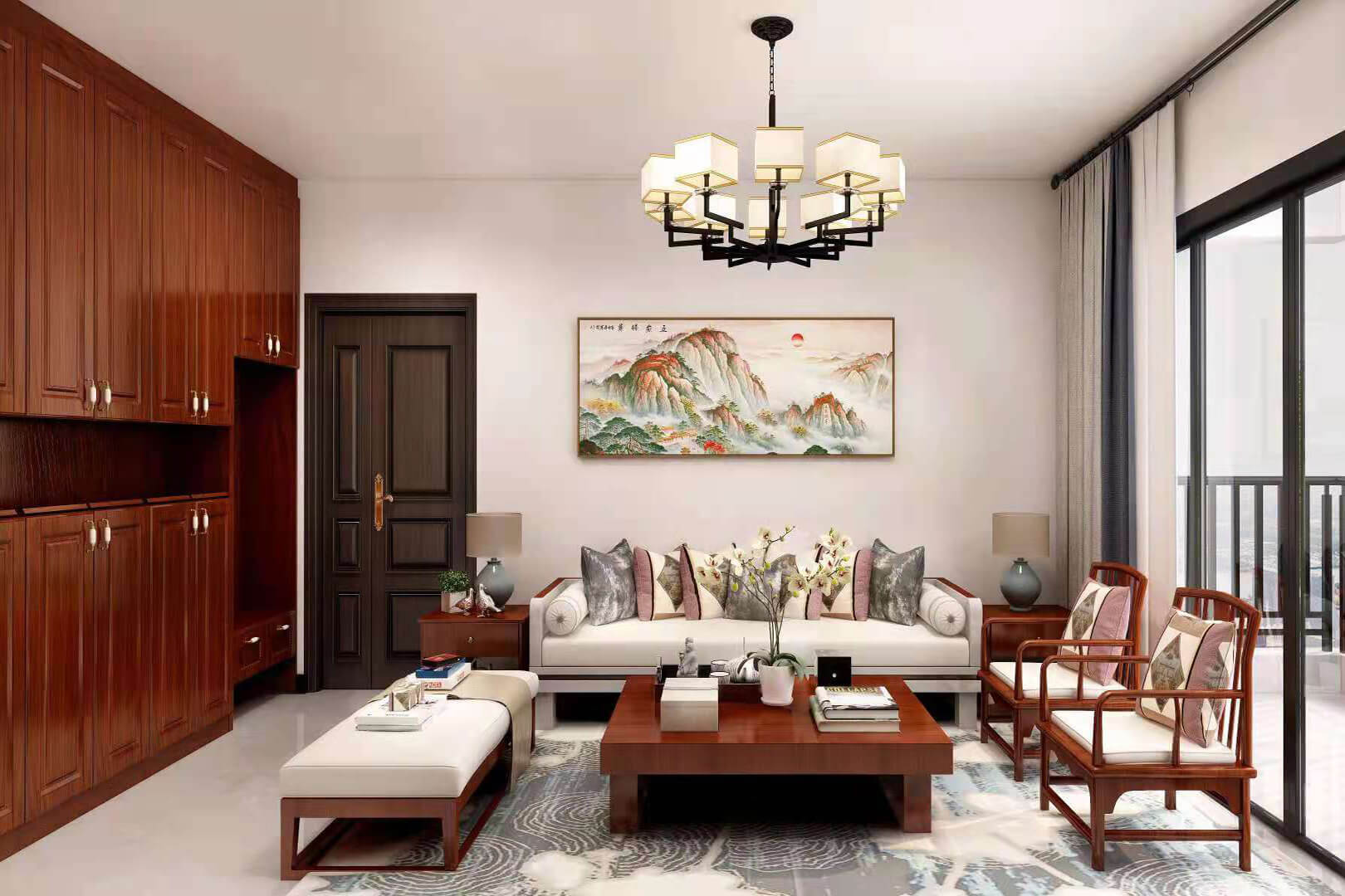 瀏覽量:552房子整體家具以紅木為主??蛷d采用白色地磚和留墻面與家具搭配讓顏色看起來(lái)更為簡(jiǎn)潔,不做裝飾的吊頂讓整體的空間看起來(lái)更寬大。房間采用紅木地板與房間家具色彩呼應(yīng),墻面留白用水墨畫裝飾讓房間裝飾更豐富,也讓色彩更多了層次感。