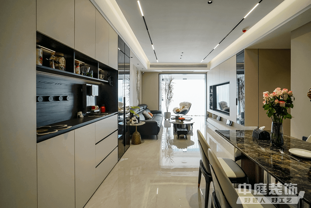 餐廳:開(kāi)放廚房與餐廳結(jié)合,形成餐、廚一體空間。所有廚房電器嵌入式設(shè)計(jì),并按照業(yè)主烹飪習(xí)慣布置,保證操作動(dòng)線便捷、合理。