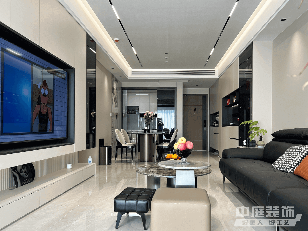 客廳:懸空的電視柜一面內(nèi)嵌屏幕,一面用來(lái)收納,隱藏設(shè)備、線路,保證空間的整潔。置入電視柜后,使動(dòng)線產(chǎn)生不同方向之間的變化,穿行自由的空間格局使生活場(chǎng)景豐富多變。