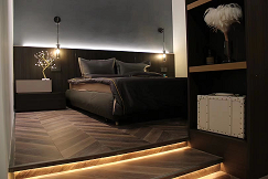 在臥室的臺(tái)階處制作地臺(tái),加燈帶氛圍烘托氣氛,做柜子有效隔開(kāi)衣帽間獨(dú)立空間。